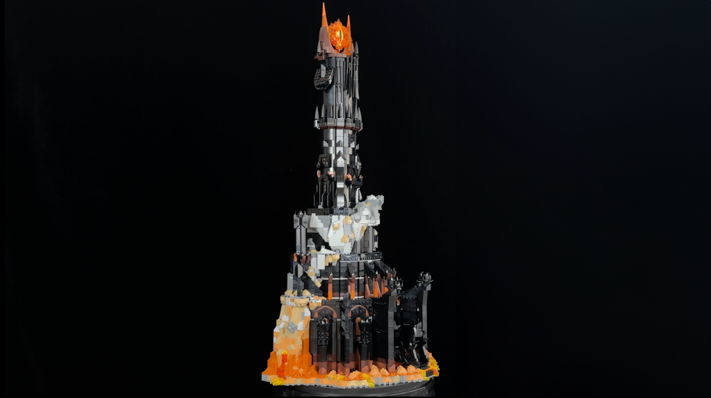 Inside, the set spans five floors, each with unique features. Highlights include the armory, a lava forge, and a dramatic throne room with Sauron’s banners and a palantír play feature. The Eye of Sauron, complete with a glowing red light brick and dynamic movement, is a show-stopper. Yet, other interior elements, like the library and Mouth of Sauron’s study, feel out of place and overly reliant on stickers.