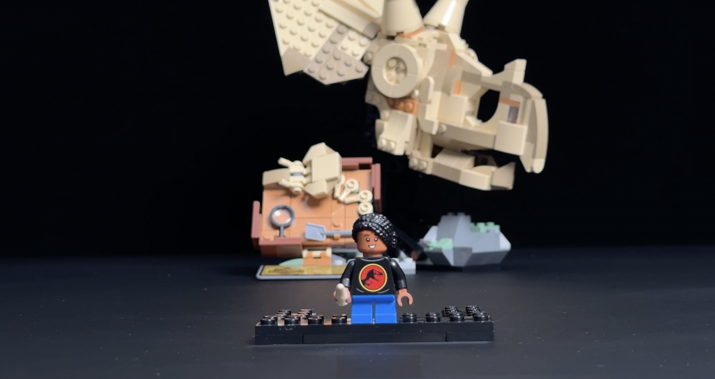 Hidden behind the skull is a fossilized mosquito, a subtle but fun Easter egg. On the right side of the base, there’s a designated spot for the minifigure, enhancing the overall display. A small rock formation on the far right supports the skull, which, despite not being fixed with additional bricks, remains surprisingly stable.