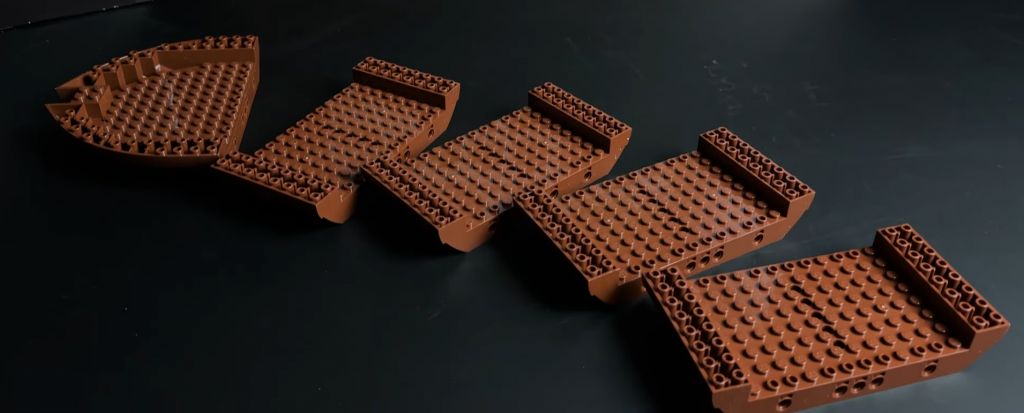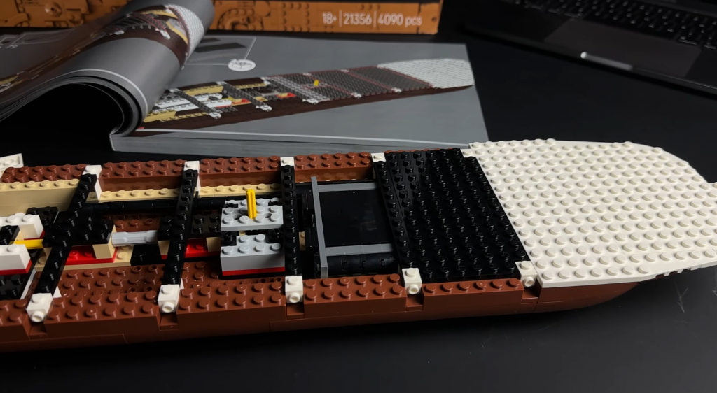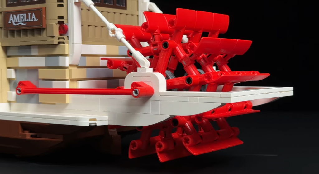 Od základne stavby je trup vytvorený z veľkých predlisovaných dielov spojených Technic pinmi. Pneumatika integrovaná vzadu je napojená na skrytý ozubený mechanizmus, ktorý poháňa otáčajúce sa lopatkové koleso pri pohybe lode. Jasná červená farba kolesa výrazne kontrastuje s tlmenejšími farbami zvyšku lode. Mechanizmus za kolesom patrí medzi zložitejšie časti stavby a vyžaduje množstvo Technic pinov.