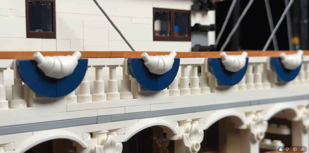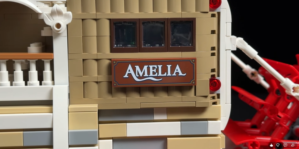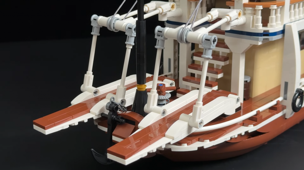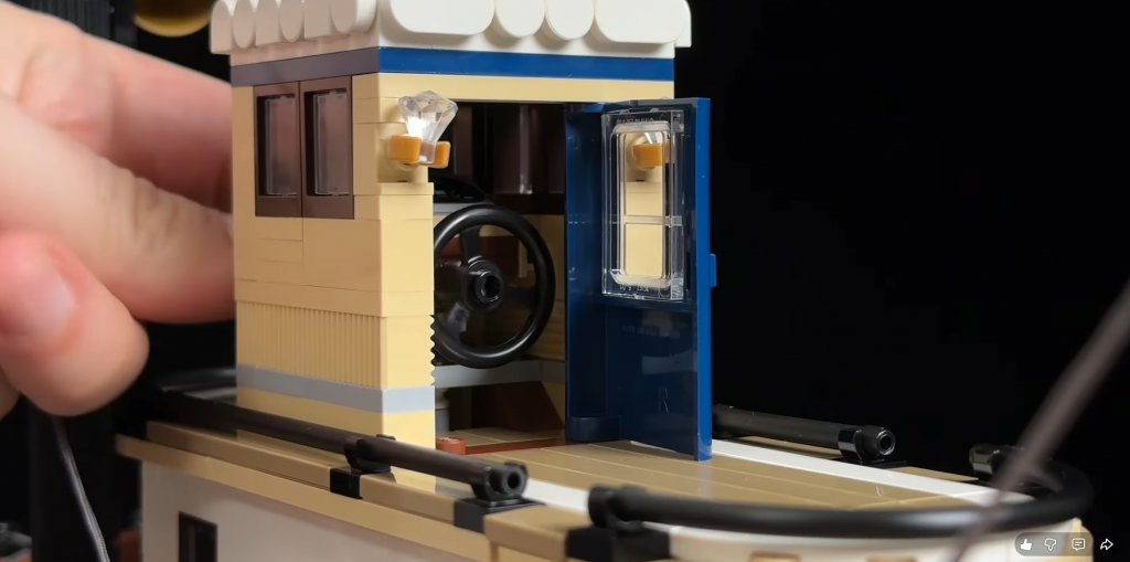 Za lopatkovým kolesom sa nachádza otočné kormidlo. Hoci loď reálne neriadi, ide o pôvabný detail, ktorý zvyšuje autentickosť. Vonkajšie obloženie pripomína drevené dosky, aj keď farebná paleta nemusí vyhovovať každému. Prvky ako zábradlia a podporné stĺpy na palube kotla však poskytujú uspokojujúci stavebný zážitok. Po stranách sú umiestnené aj záchranné kruhy pre dodatočný detail.