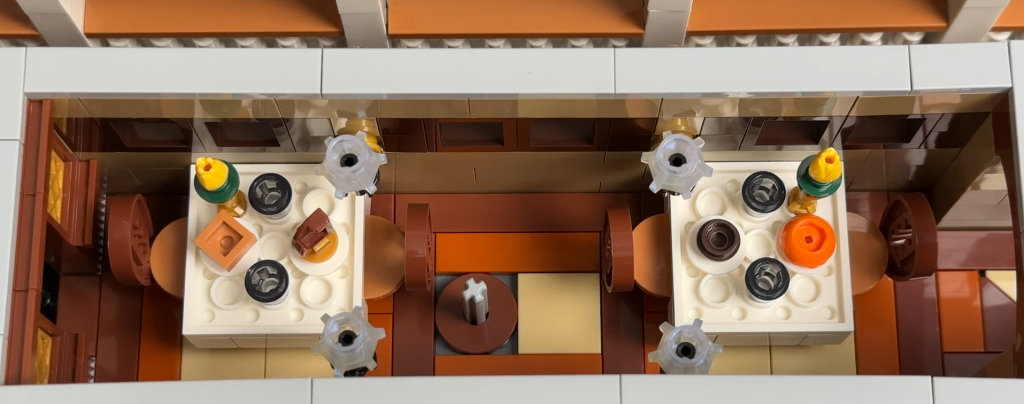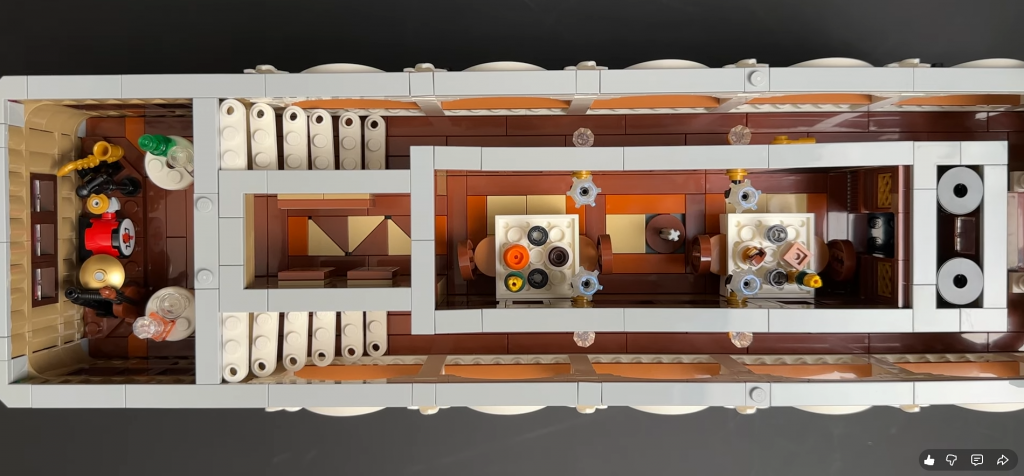Smerom dozadu je reštauračná časť, šikovne postavená pomocou obrátených dielikov ako stolov. Priestor je pripravený na večeru, no pôsobí prázdne, čím opäť podporuje atmosféru „lode duchov“. Na chodbe sa nachádzajú nálepky odkazujúce na iné LEGO sety, napríklad vyradenú A-Frame Cabin, a aj zábavné easter egg cameo Lochnesskej príšery. Ďalšie nálepky zobrazujú menu a reklamu na hudobné vystúpenie s dátumom 5. júna — možno náznak budúceho setu.
